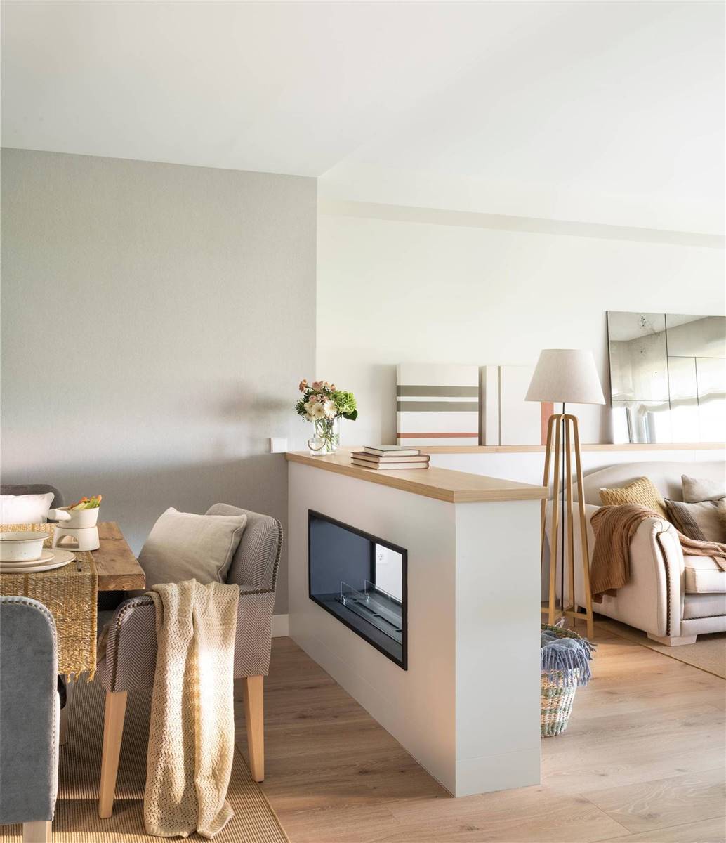 این طراح داخلی، دو بخش را با استفاده از یک دیوار کوتاه که شومینه در آن تعبیه شده، و همچنین با دو رنگ مختلف، از هم جدا کرده است: خاکستری روشن برای غذاخوری و سفید برای نشیمن. این راهی عالی برای شخصیسازی هر فضا است.